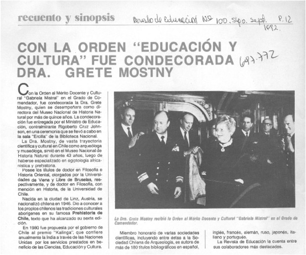 Con la orden "Educación y Cultura" fue condecorada Dra. Grete Motsny. [artículo]