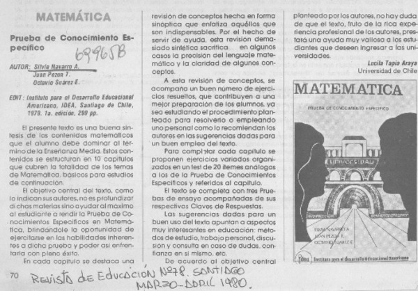 Autores chilenos - Navarro Adriasola, Silvia - Matemática, prueba de conocimiento específico - Pezoa Tapia, Juan H. - Suárez Escobar, Octavio