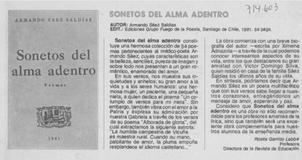 Sonetos del alma adentro [artículo] Rosita Garrido Labbé.