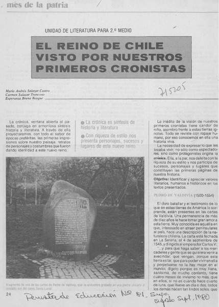 El reino de Chile visto por nuestros primeros cronistas [artículo] Mario Andrés Salazar Castro, Carmen Salazar Troncoso <y> Esperanza Bruna Bosque.