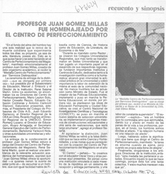 Profesor Juan Gómez Millas fue homenajeado por el centro de perfeccionamiento. [artículo]