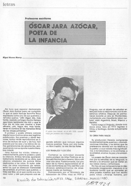 Oscar Jara Azócar, poeta de la infancia [artículo] Miguel Moreno Monroy.