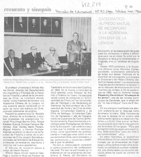 Catedrático Alfredo Matus se incorporó a la Academia Chilena de la Lengua. [artículo]