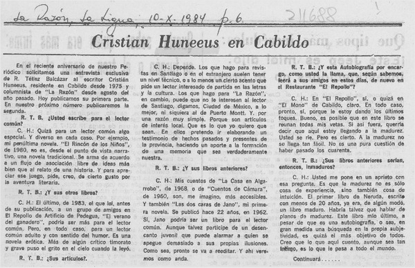 Cristián Huneeus en Cabildo [artículo] R. Téllez Balcázar.