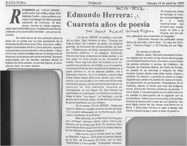Edmundo Herrera, cuarenta años de poesía [artículo] Jaime Miguel Gómez Rogers.