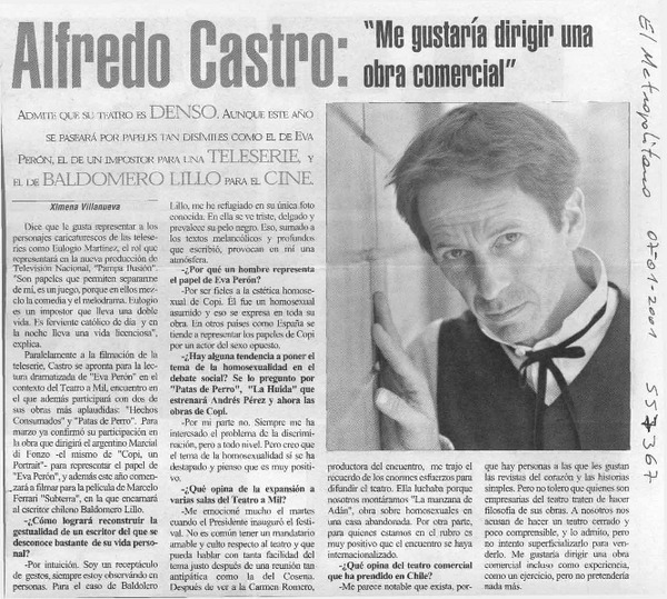 Alfredo Castro, "Me gustaría dirigir una obra comercial" [artículo] Ximena Villanueva