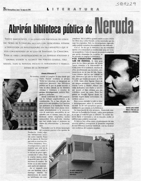 Abrirán biblioteca pública de Neruda [artículo] Ximena Villanueva