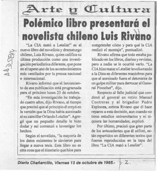 Polémico libro presentará el novelista chileno Luis Rivano [artículo].