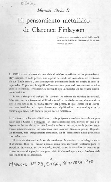 El Pensamiento metafísico de Clarence Finlayson [artículo] Manuel Atría R.