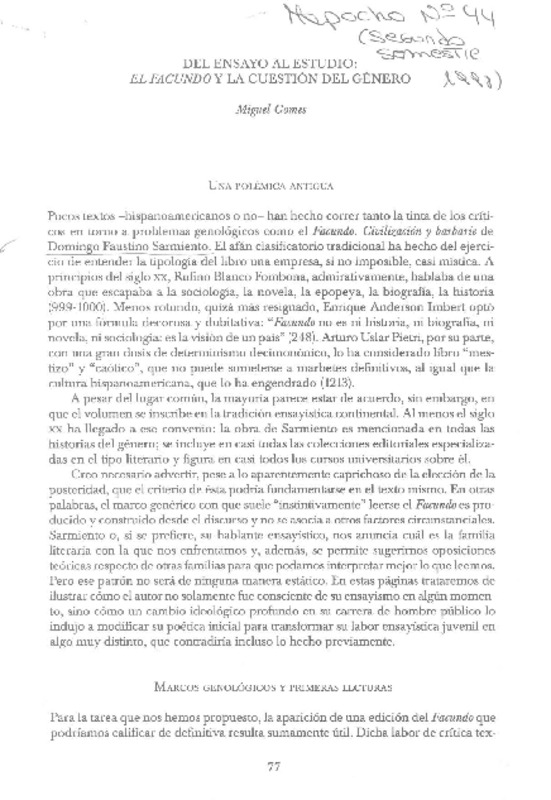 Del ensayo al estudio: El Facundo y la cuestión del género [artículo] Miguel Gómes.