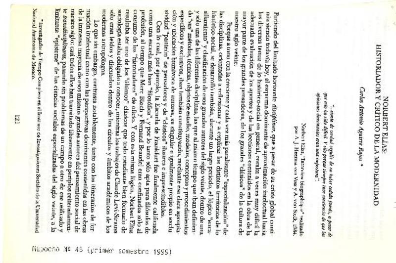 Norbert Elías : historiador y crítico de la modernidad [artículo] Carlos Antonio Aguirre Rojas.