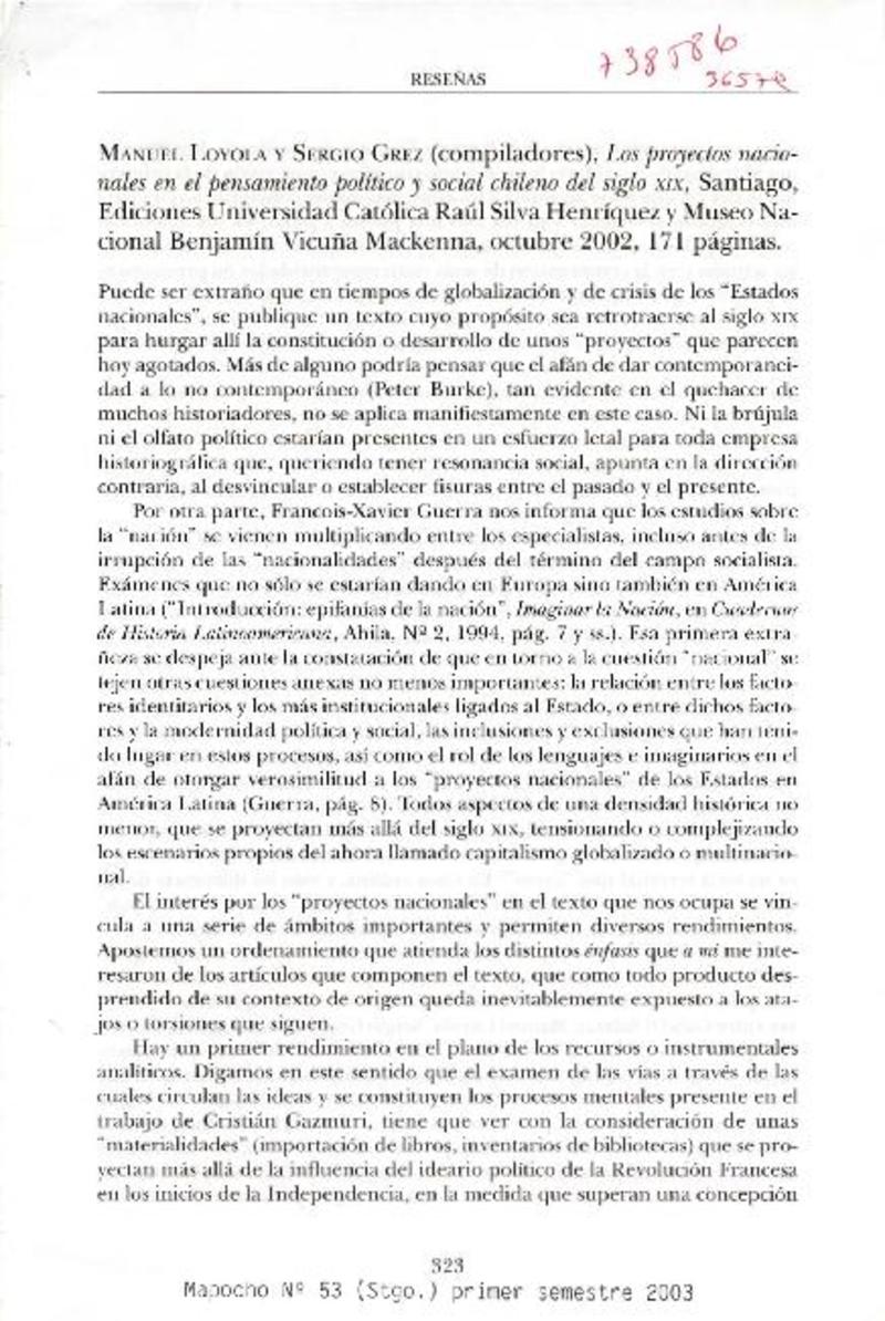 Los proyectos nacionales en el pensamiento político y social chileno del siglo XIX [artículo] Carlos Ossandón B.