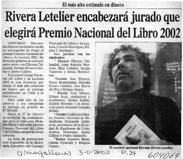 Rivera Letelier encabezará jurado que elegirá Premio Nacional del Libro 2002 [artículo]
