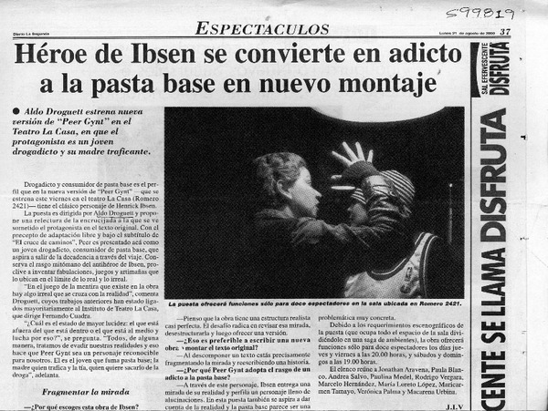 Héroe de Ibsen se convierte en adicto a la pasta base en nuevo montaje [artículo] J. I. V.
