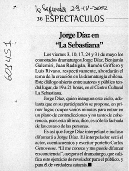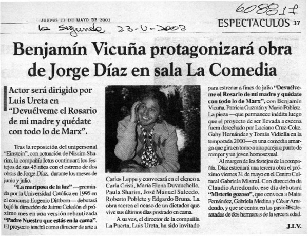 Benjamín Vicuña protagonizará obra de Jorge Díaz en sala La Comedia [artículo] J. I. V.