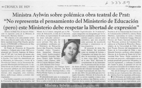 Ministra Aylwin sobre polémica obra teatral de Prat, "No representa el pensamiento del Ministerio de Educación (pero) este Ministerio debe respetar la libertad de expresión" [artículo]