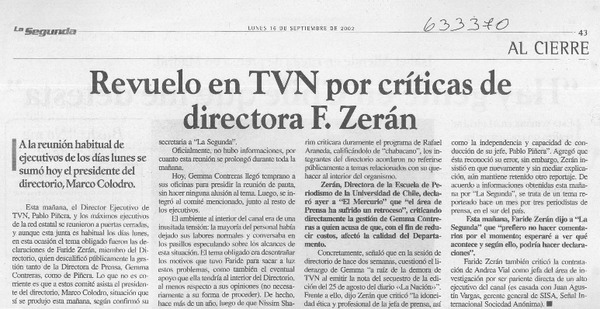 Revuelo con TVN por críticas de directora F. Zerán [artículo]