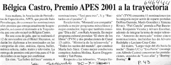 Bélgica Castro, Premio Apes 2001 a la trayectoria [artículo]