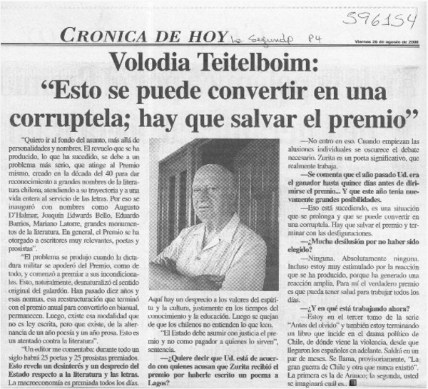 Esto se puede convertir en una corruptela, hay que salvar el premio [artículo] Volodia Teitelboim.