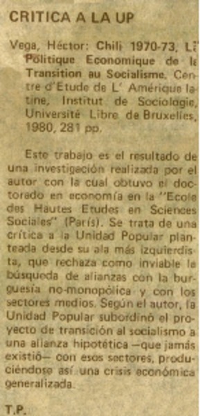 Autores chilenos - Vega, Héctor - Chili 1970-73: la politique economique de la transition au socialime