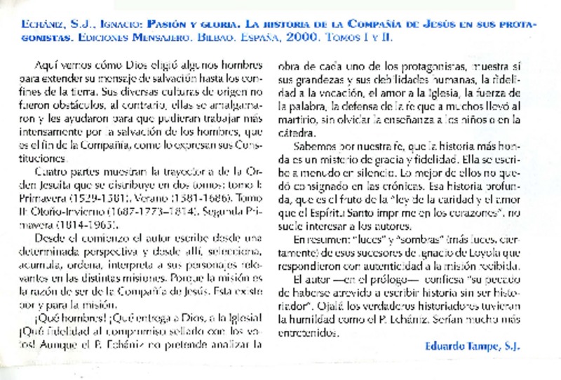 Pasión y gloria. La Historia de la Compañía de Jesús en sus protagonistas [artículo] Eduardo Tampe.