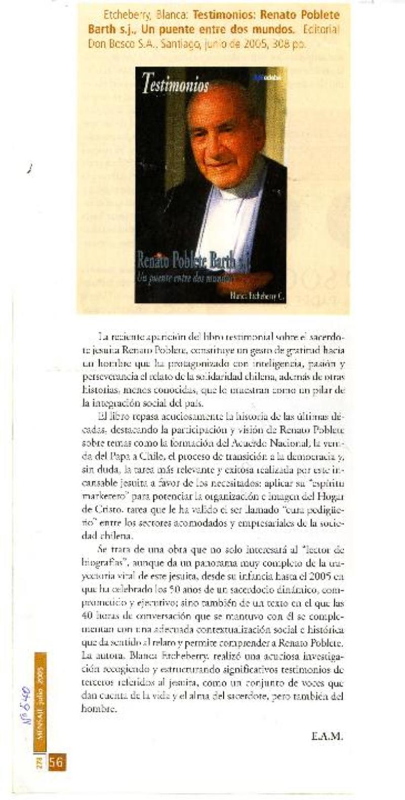 Testimonios: Renato Poblete Barth s. j., Un puente entre dos mundos [artículo]E.A.M.