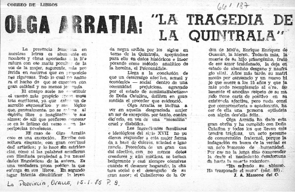 Olga Arratia: "La tragedia de La Quintrala" [artículo] J. A. Massone del C.