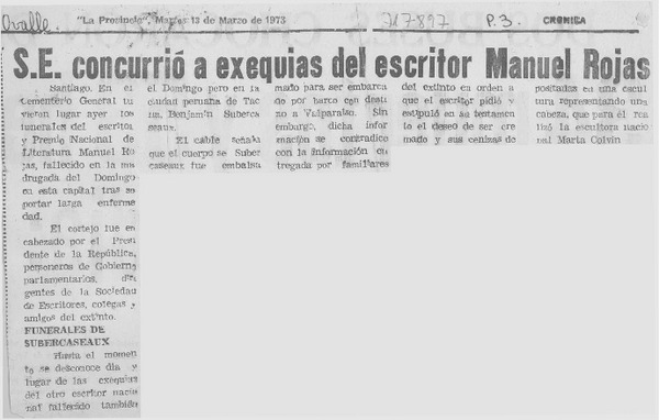 S.E. concurrió a exequias del escritor Manuel Rojas. [artículo]