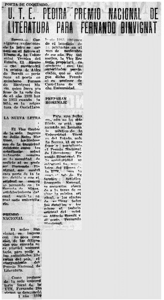 U. T. E. pedirá Premio Nacional de Literatura para Fernando Binvignat. [artículo]