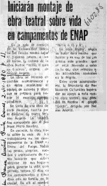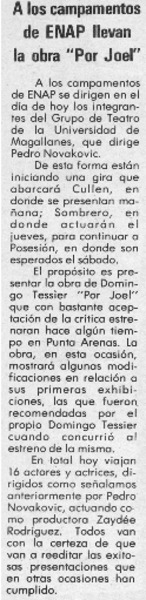 A los campamentosde ENAP llevan laobra "Por Joel". [artículo]