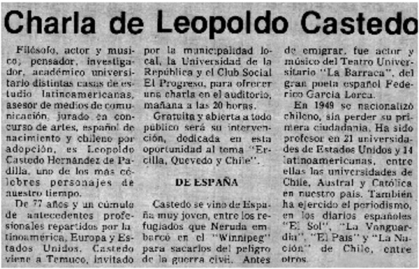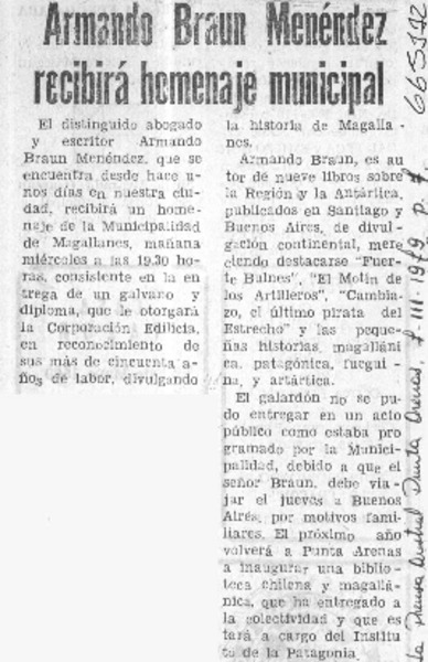 Armando Braun Menéndez recibirá homenaje municipal. [artículo]