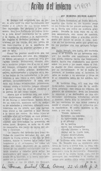 Arribo del invierno [artículo] Marino Muñoz Lagos.