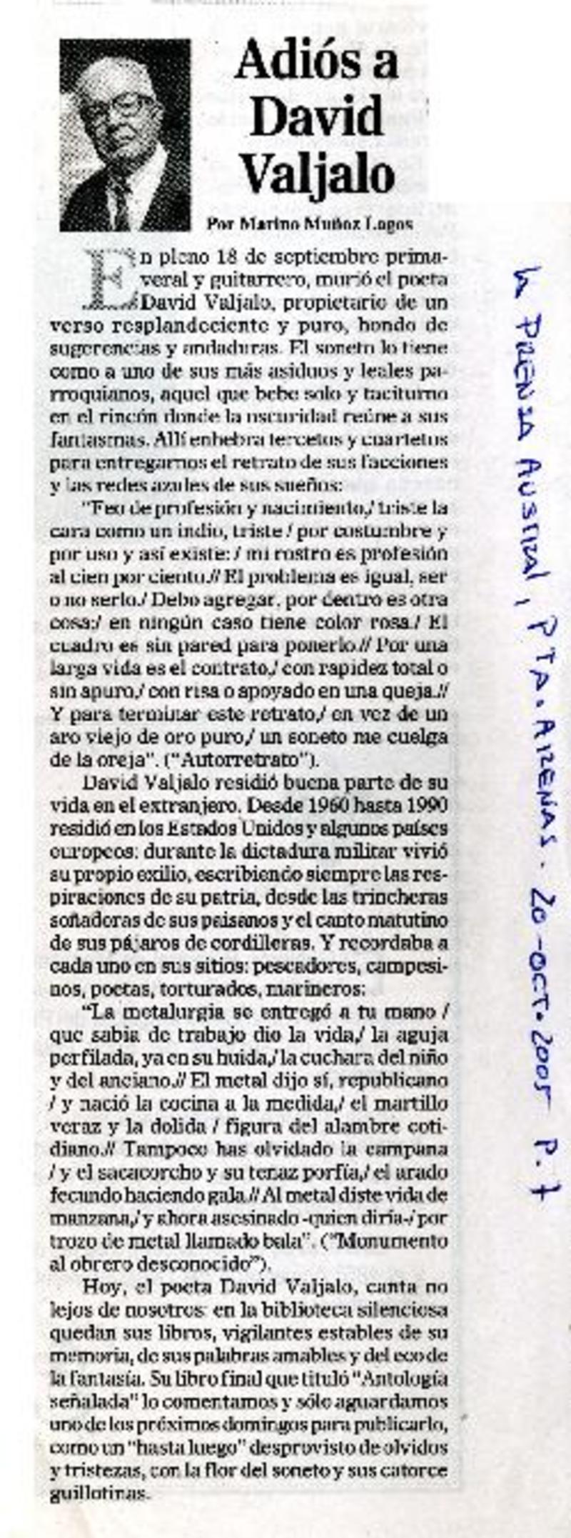 Adiós a David Valjalo, [artículo]Marino Muñoz Lagos.