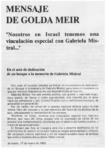 "Nosotros en Israel tenemos una vinculación especial con Gabriela Mistral..." [artículo] Golda Meir.