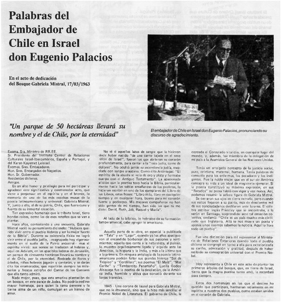 Palabras del embajador de Chile en Israel don Eugenio Palacios. [artículo]