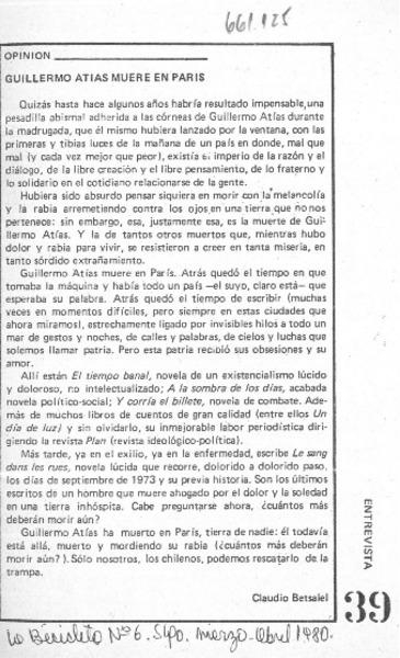 Guillermo Atías muere en París [artículo] Claudio Betsabel.