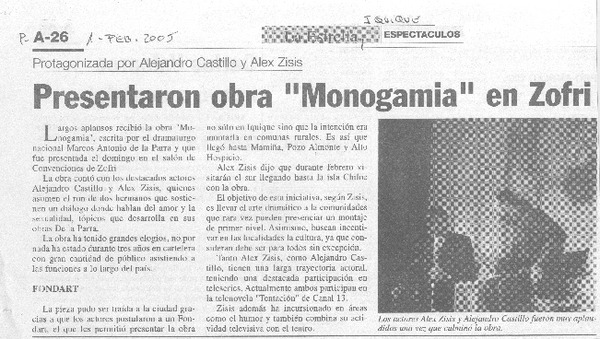 Presentaron obra "Monogamia" en Zofri. [artículo]