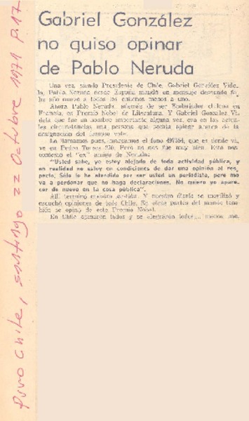 Gabriel González no quiso opinar de Pablo Neruda. [artículo]