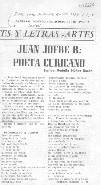 Juan Jofré B.: poeta curicano [artículo] Rodolfo Núñez Durán.