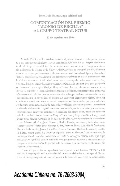 Comunicación del Premio "Alonso de Ercilla" al grupo teatal ICTUS [artículo] José Luis Samaniego Aldazával.