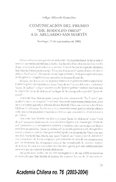 Comunicación del Premio "Dr. Rodolfo Oroz" a D. Abelardo San Martín [artículo] Felipe Alliende González.