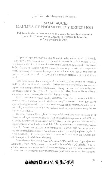 Emma Jauch: maulina de nacimiento y expresión [artículo] Juan Antonio Massone del Campo.