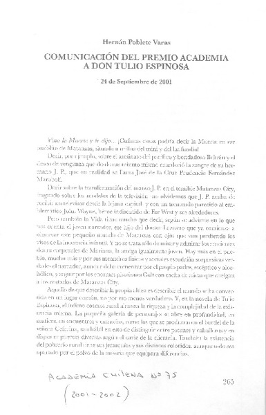 Comunicación del Premio Academia a don Tulio Espinosa [artículo] Hernán Poblete Varas.