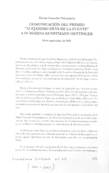 Comunicación del Premio "Alejandro Silva de la Fuente" a Da. Marina Kunstman Oettinger [artículo] Héctor González Valenzuela.