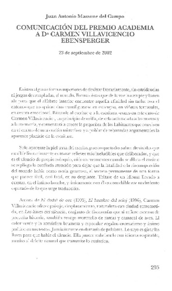 Comunicación del Premio Academia a Da. Carmen Villavicencio Ebensperger [artículo] Juan Antonio Massone del Campo.
