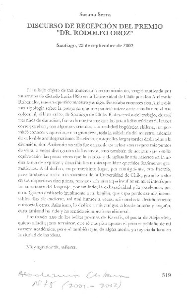 Discurso de recepción del Premio "Dr. Rodolfo Oroz" [artículo] Susana Serra.