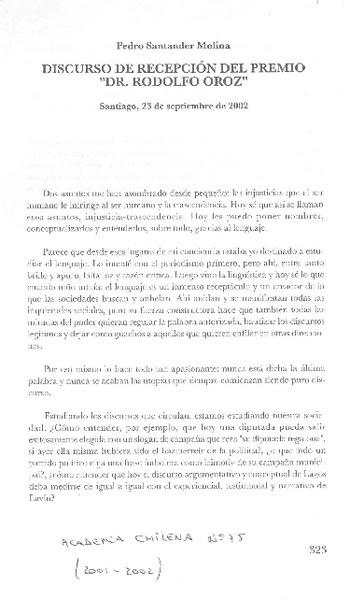Dicurso de recepción del Premio "Dr. Rodolfo Oroz" [artículo] Pedro Santander Molina.
