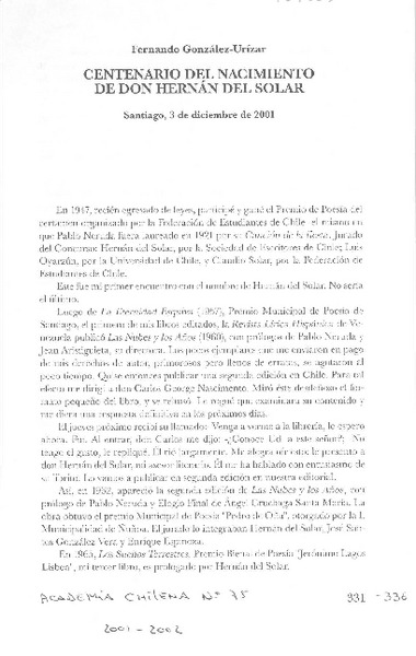 Centenario del nacimiento de don Hernán del Solar [artículo] Fernando González-Urízar.