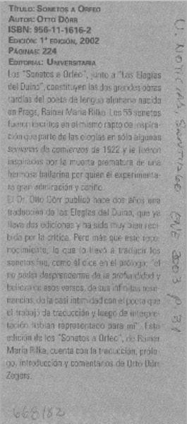 Sonetos y orfeo - Dörr, Otto - Autores chilenos
