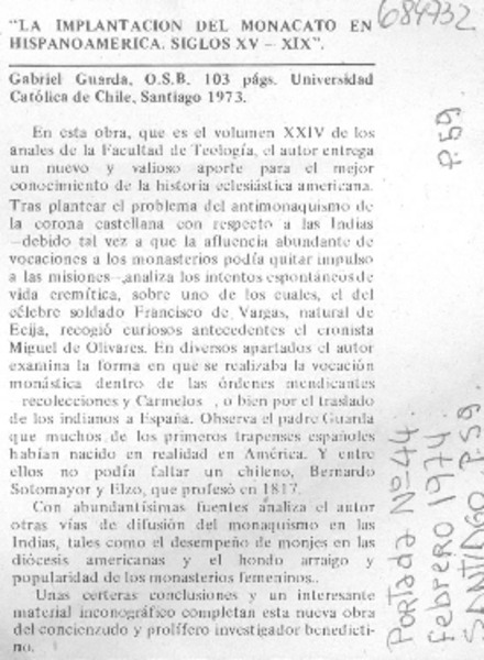 Autores chilenos - Guarda, Gabriel - Implantación del monacato en hispanoamérica, siglos XV-XIX